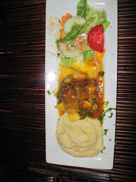 Puerca con Pina: pork tenderloin stuffed with mango & pineapple with mashed potatoes and salad topped with a ginger vinaigrette. It was delicious.